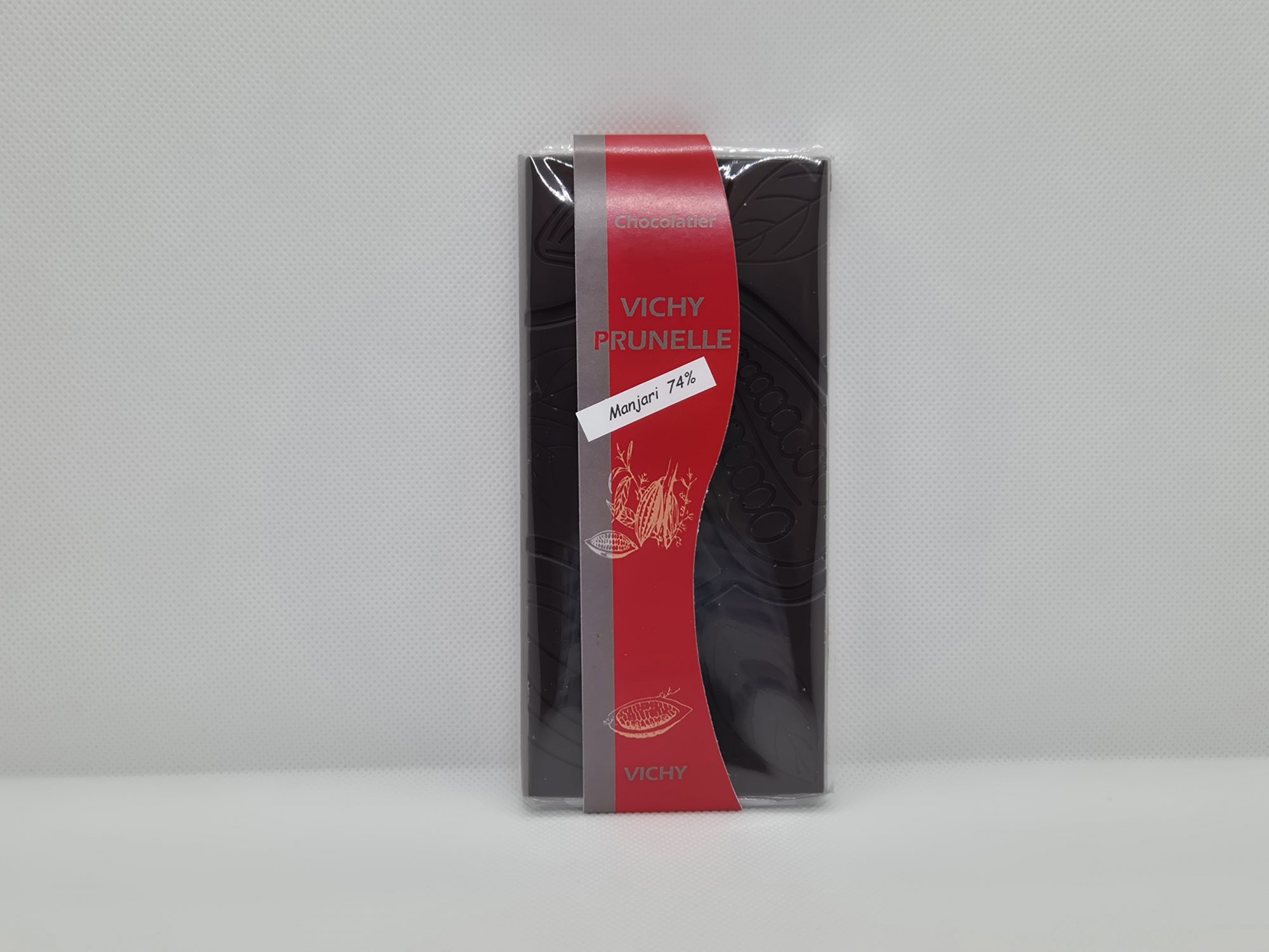Manjari 74% origine MADAGASCAR, pur beurre de cacao, pâte de cacao. Chocolat noir fruité avec des notes acidulées de fruits rouge fabrication maison